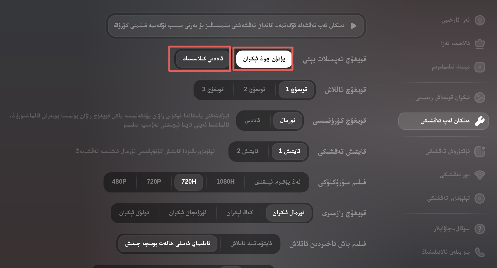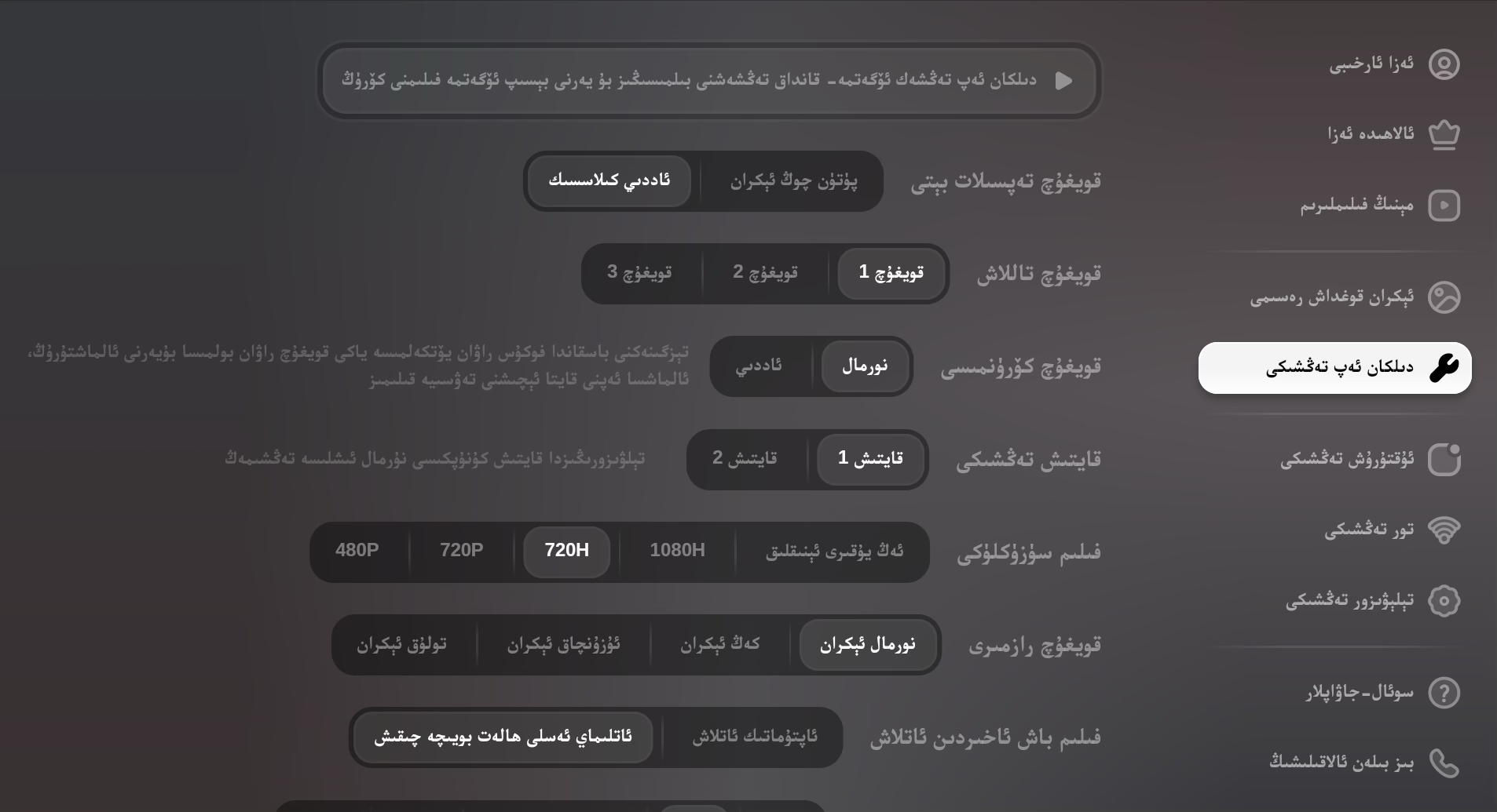 كىنو قويۇلغاندىن كېيىن چىقىدىغان قويغۇچ تەپسىلات بېتىنى تەڭشىمەكچى بولسىڭىز، تەڭشەكتىن «قويغۇچ تەپسىلات بېتى»نى تاللاپ، پۈتۈن چوڭ ئېكران، ئاددىي كېلاسسىك بەت ئىككىسىدىن خالىغاننى تاللىسىڭىزلا بولىدۇ.