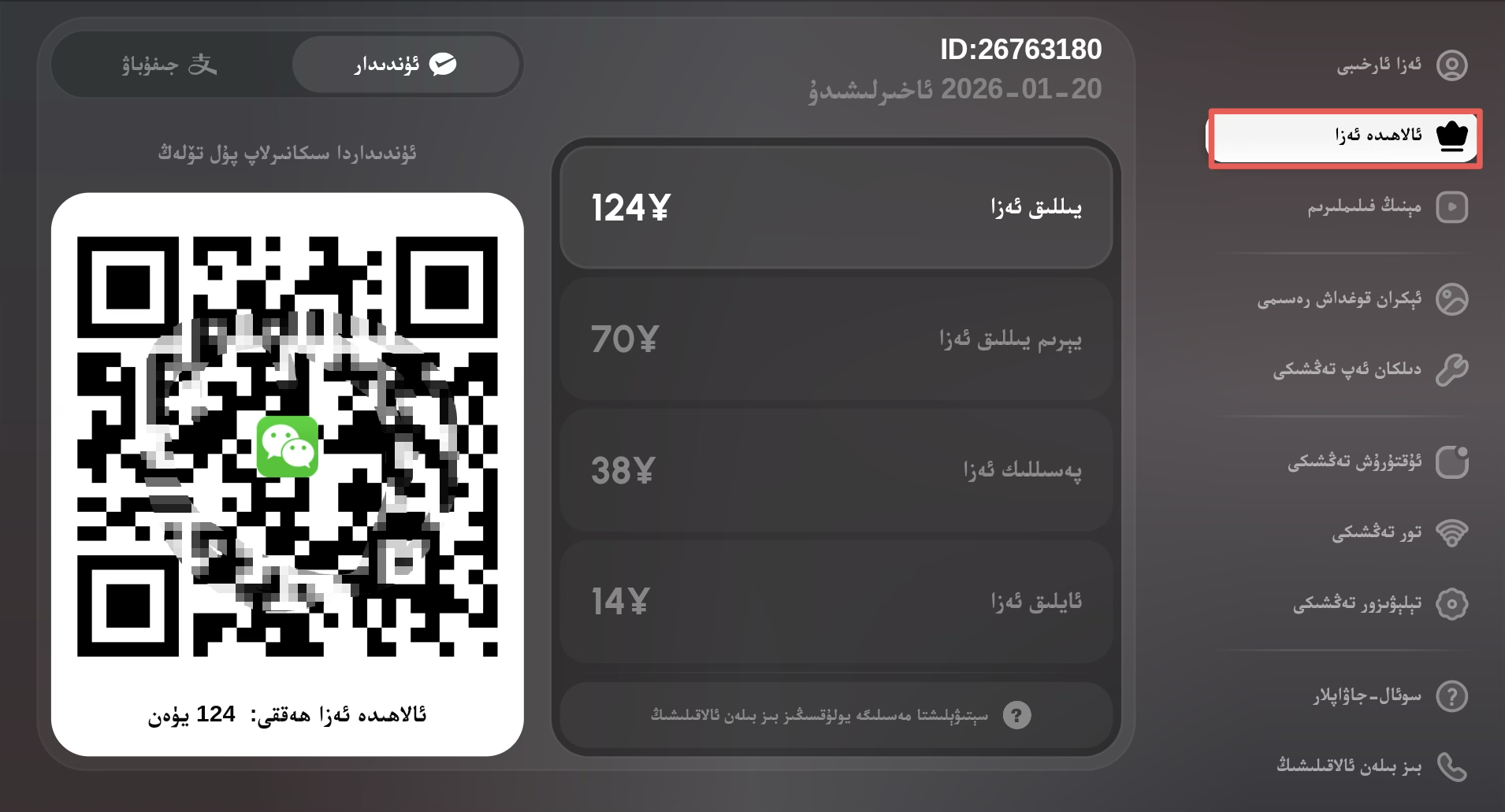 ئەزالىق سېتىۋالماقچى بولسىڭىز ئەڭ ئۈستىدىكى id نومۇرىڭىز كۆرۈنۈپ تۇرغان يەردىن ياكى «ئەزا مەركىزى»دىن «ئالاھىدە ئەزا»نى تاللاپ كىرىپ سېتىۋالسىڭىز بولىدۇ.
