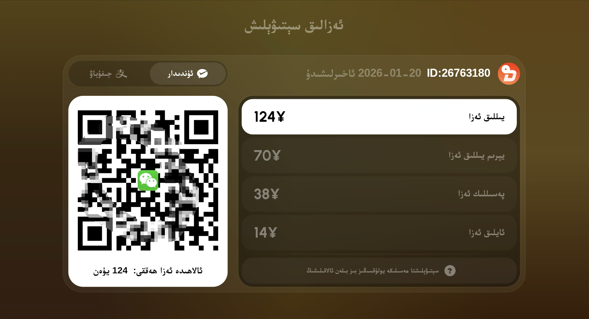 دىلكاندا ئايلىق، پەسىللىك، يېرىم يىللىق، بىر يىللىق ئەزالىق يۈرۈشلۈكى بار، ئېھتىياجىڭىزغا قاراپ سېتىۋېلىڭبىر ئايلىق باھاسى: 14 يۈەنپەسىللىك باھاسى (ئۈچ ئاي): 38 يۈەنيېرىم يىللىق باھاسى (ئالتە ئاي): 70 يۈەنبىر يىللىق باھاسى (ئون ئىككى ئاي): 124 يۈەن