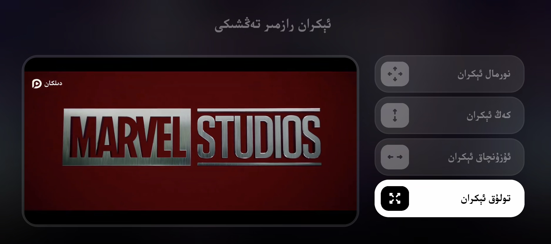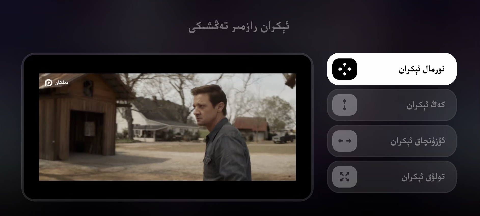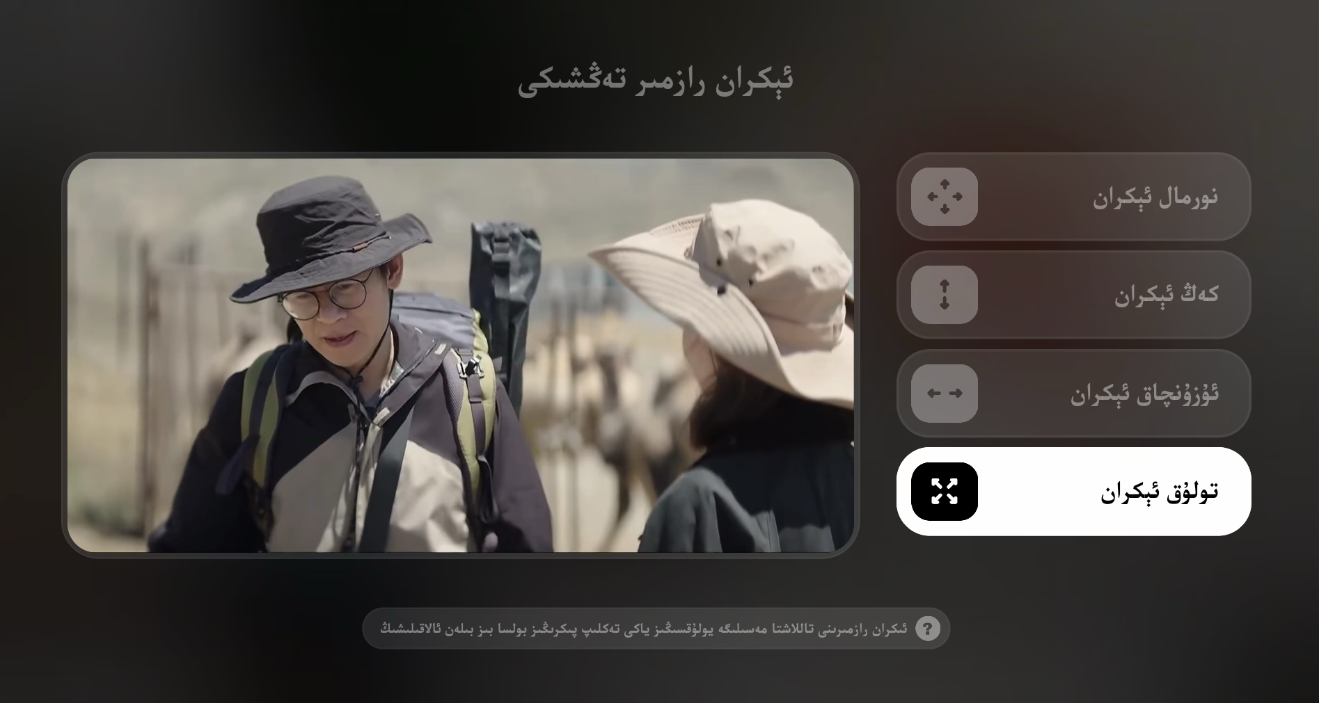 كىنو قويۇلغاندا تىزگىنەكنىڭ ئاستى ▼ كونۇپكىسىنى باسسىڭىز تەڭشەكلىرى چىقىدۇ. شۇنىڭدىن «ئېكران رازمىرى»نى تاللاپ، ئېھتىياجىڭىز بويىچە تەڭشىسىڭىز بولىدۇ.